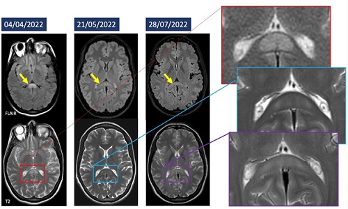 Brain CT scan was unremarkable. MRI showed an oval-shaped, ill-defined lesion hyperintense in T2w and DWI, without enhancement after gadolinium injection in T1w images, in the splenium of corpus callosum, which was swollen [2].