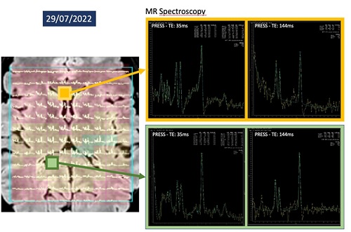 Figure 2: MRI showed a reduction in lesion size, although MR spectroscopy showed a decrease in metabolites levels in the splenium.