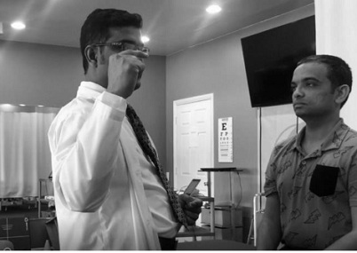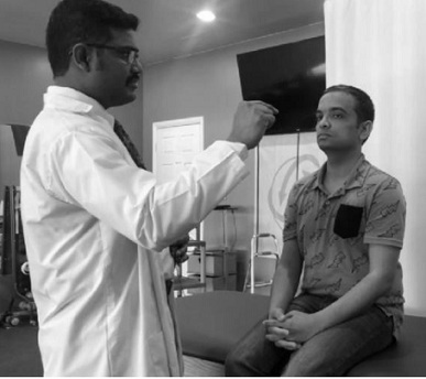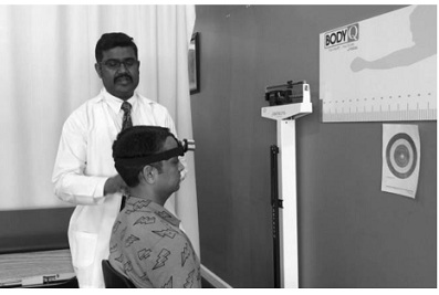 The patient was asked to read an eye chart in a static position and then he was asked to move the head side to side at a 2 Hz frequency (figure 6). More than a 3 line drop in identifying the letters and numbers with dynamic head movement suggest peripheral vestibular hypofunction. The patient exhibited a 1 line drop.