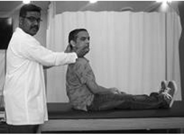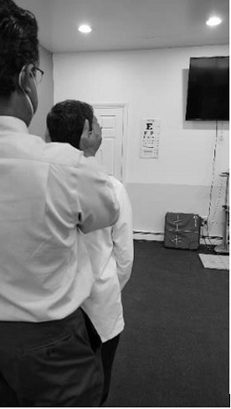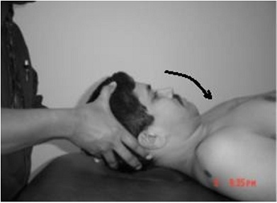 This test was done to differentiate the cause of the dizziness originating from a vestibular versus a cervicogenic source. For a cervicogenic source, the head was stabilized by the clinician and patients trunk was rotated. For a vestibular source, the head and trunk were rotated together (figure 11). Provocation of dizziness was noted. There was provocation of dizziness on combined head and trunk rotation.