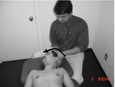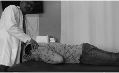 Treatment continued with manual therapy to the upper and mid cervical paraspinals and joint mobilization to improve OA forward nodding and AA rotation [3]. The first visit concluded with Brandt Daroff exercises [15], for home. This involved the patient seated in an upright position. He was then moved into a side lying position on to one side with the nose pointed up at about a 45-degree angle. He was made to remain in this position for about 30 seconds. He was then moved back to the seated position and the same maneuver was repeated on the other side (Figure 15).