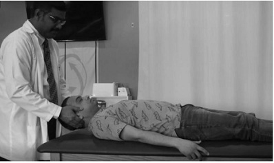The testing then proceeded to assessing cervical range of motion [3]. Which is typically not routinely done in a vestibular assessment. The testing proceeded to assessing cervical range of motion targeting the occiput (C0,C1) and upper cervical spine (C1,2). C0/C1 was assessed by performing occiput forward nodding (figure 12). C1C2 was assessed by performing cervical rotation with the occiput in flexion (figure 13). The normal range of occipital flexion is approximately 15-20 degrees and the normal range for upper cervical rotation is approximately 50 degrees on each side. There was obvious restriction of the C0, C1 joint in forward nodding and the C1C2 in rotation with the left side appearing more restricted than the right. This was followed by testing combined upper and lower cervical mobility. Normal range of motion at cervical spine is approximately 80-90-degrees of flexion, 70 degrees of extension, 20-45 degrees of side bending and 90 degrees of rotation. The ranges observed in the patient on testing were 60 degrees of flexion, 60 degrees of extension, 30 degrees of side bending and rotation of 60 degrees to the left and 75 degrees to the right.