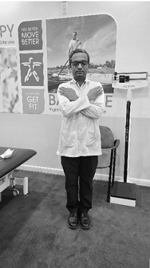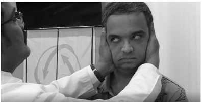 Smooth pursuit was tested in neutral and compared with neck torsion position. The patient was asked to fix his gaze on the moving pointer finger of the examiner (figure 10). Abnormal gaze pursuit in neck torsion position might suggest the examiner to consider involvement of neck immobility as cause of dizziness. Pt did not report of dizziness while the test was performed but reported that this position often caused a sensation of disequilibrium while at work.