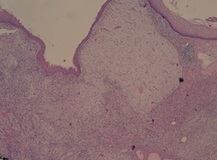 Macroscopic examination revealed a 3.1 x 2.6 cm lesion with a bozzellated and partly hemorrhagic surface.