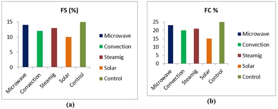 Microwave and steaming reflected highest foaming stability among all thermal treated rice bran samples whereas, lowest was seen in case of solar treated sample. Solar drying generally alters the surface property of sample and also leaves residual moisture in the sample leading to reduction in its foaming stability. Thus, significant decrease in foaming stability was observed in solar drying. Contrary microwave and steaming being faster in nature remove more moisture and preserve natural surface properties creating a better foaming stability Bandyopadhyay et al. [26], also studied thermal treatment on defatted rice bran and found similar result in case of foaming stability.