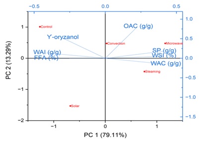 The stabilization of rice bran through thermal treatments, convection, microwave, steaming, and solar demonstrated distinct impacts on its physicochemical properties, as analyzed by PCA. Principle Component 1 (PC1) accounted for 79.11% of the variance, with PC2 contributed to 13.29% of the dataset (Table 2). From figure 3, microwave treatment exhibited the strongest influence, positioned farthest from the origin, indicating significant enhancement in variables such as γ-oryzanol, WAI, and WSI. Steaming and solar treatment also contributed positively, though to a lesser extent, while convection showed moderate effect to stabilization. The control sample remained near the origin, reflecting minimal alteration. These findings underscore the efficacy of microwave and steaming methods in preserving bioactive compounds and improving functional attributes of stabilized rice bran.