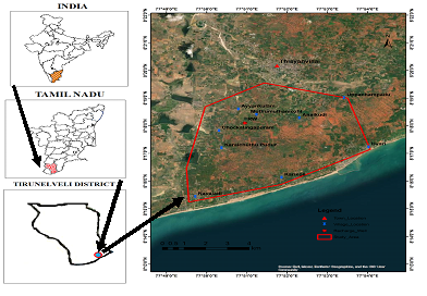In this research, the study area is in and around the Ayyankulam Recharge Well of Thangammalpuram Village, Radhapuram Block, Tirunelveli District, which is a subbasin of Nambiyar (Figure 1a). The Nambiyar River is the major river that runs from west to east through the study area, and it is a seasonal river. As surface water supplies have been limited, groundwater has become the primary source for the drinking and irrigation water sectors. The tail end of the Nambiyar basin was chosen for this research. Aeolian soil, sandstone, limestone, sedimentary rock, and base rock dominate the subsurface of the study area. The area of the study area is 45 km2 and lies between the geographical coordinates of Latitude 8°15'15" N - 8°19'30" N and Longitude 77°49'30" E - 77°54'00" E. The eastern boundary is bounded by the Bay of Bengal.