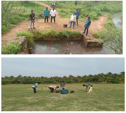 The primary data location is shown in Figure 1b. The water levels from an open well and a bore well were checked every fifteen days. The Wenner (2-profile) and Schlumberger electrode arrangement (12 VES) methods were employed to acquire resistivity data. 100 total magnetic data points were gathered from the study region at a grid of 300 m x 300 m, as shown in Figure 2. Lithology information was gathered from the open well and bore well already on or near the site. The artificial recharge well in Ayyankulam is shown in Figure 3. The well is 3 m in length and 2 m in width (rectangular well). The system tank for the Nambiyar subbasin is the Thangamalpuram tank. It is the tank for the nearby recharge well, and both are connected through a canal. The canal is 1.5 m deep and 3 m wide. 1.2 to 1.5 m3/sec of water have flown into this well in 50 days.