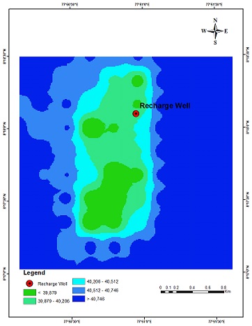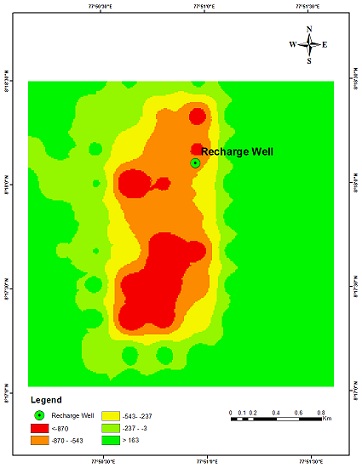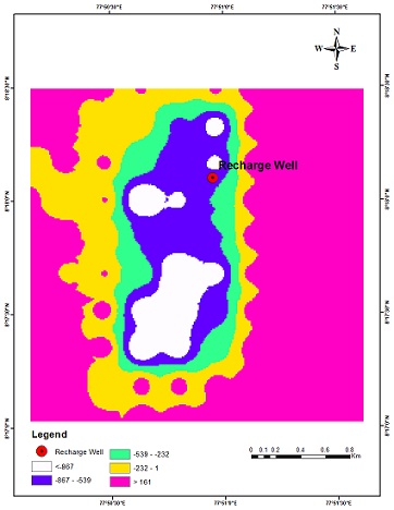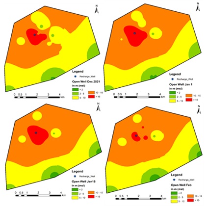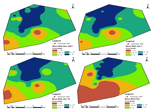 A spatial groundwater fluctuation map of an open well for various time steps in mean sea level (msl) is shown in Figure 16. There are five different categories on this map. It is rather obvious that the forms of the nearby recharge wells vary continuously every fifteen days. An open well's water level is a dynamic representation of shallow aquifer groundwater storage. Irrigation tanks and infiltration techniques can refill shallow aquifers. However, the input from the recharge well abruptly stopped, causing the water levels in the nearby monitoring wells to plummet as a response. The Figure 17 displays a groundwater bore well fluctuation map for a number of time steps in mean sea level (msl). On this map, there are five different categories. The patterns of the neighbouring recharge wells are constantly fluctuating every 15 days, which is highly obvious. The fluctuating water level in the bore wells represents semi-confined or confined aquifer groundwater storage. Semi-confined and confined aquifers can be filled by vertical flow (leakage) from shallow aquifers and abandoned bore well systems as shown in Figure 18. However, when the recharge well's input abruptly stopped, the water levels in the monitoring wells dropped as a result.
