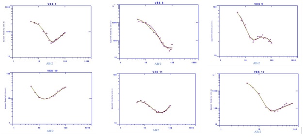 In the qualitative interpretation approach, the number of layers and their resistivity are calculated using the field curve's shape as a guide. It provides details on the number of layers present, their continuity over the entire region, and the degree of homogeneity or heterogeneity present in each layer. The field resistivity sounding curves with two and three layers in the research area are shown in Figures 13a&b. This graph mostly contains H-type curves. The possible groundwater indication in the study area is reflected in it.