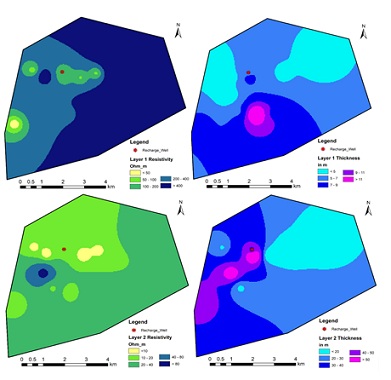 To validate the findings, the quantitative interpretation of the VES curve was connected and compared with the lithology based on the existing open well depth. The VES and lithology data match quite well up to this depth, as shown in Figure 14. Each layer's resistivity range and layer thickness (quantitative information) were found and are shown. VES 8 got a minimum of two layers, while VES 6 and 9 got a maximum of four layers, with the remaining layers all being three. The Figure 15a shows the spatial map of resistivity and layer thickness. The variation in the top layer of soil is shown on the layer 1 resistivity spatial map. Seashore sand and Aeolian soil both have resistivities that are greater than 400 ohm-m. A resistivity value of less than 50 ohm-m is produced by the clay type. In contrast to sandy clay, which produces values between 200 and 400 ohm-m, silty clay produces values between 50 and 200 ohm-m. Greater depth was found on the southern side of the recharge well, where the thickness of layer 1 varied from less than 5 to more than 11 metres. In the study region, different colours depict changes in layer thickness.