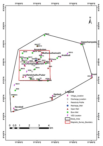 The main field of the Earth is perturbed by various combinations of induced and remnant magnetization found in magnetic rocks [19]. According to research done by [20-21], locations with high elevation have comparatively high magnetic susceptibility. Zones with high magnetic susceptibility are likely to be younger and have less secondary porosity, which would allow for easier groundwater recharge. The groundwater potentiality and subsurface hydrogeological setting were investigated by using an integrated methodology based on a combination of remote sensing and geophysical techniques (Aero magnetics and VES) [22]. This was done to aid decision-makers in their upcoming development plans. [23] Assessed the preferred flow pathways at each location and contrasted the various sites through MARS. A groundwater investigation in regions, where the hard rock aquifer system is significantly impacted by weathering was done in 2021 by this strategy is better for evaluating groundwater resources than more conventional ones [24]. [25] Aimed to identify surface and subsurface structures, define their effects on groundwater flow direction, and measure the thickness of the groundwater aquifers (accumulation) in their study region. [26] Concluded that overburden thickness calculation and structure mapping were needed for groundwater potential evaluation in a typical basement complex terrain, which could be reliably done using the magnetic approach. Have proven Electrical resistivity imaging to be a successful and affordable method for mapping the near-surface karst development, particularly the sites of the prospective water flow pathways, due to the resistivity variations between the water-filled karst and the bedrock. According to [27]. In comparison to other infiltration basins that are separated from their respective extraction wells by fine-grained materials, some portions of the infiltration basins have hydraulic linkages to the extraction wells through preferential flow routes depending on the electrical resistivity data. [28] Identified various flow systems and hydraulic traps and mapped resistivity differences. [29] Investigated the spatial and temporal mixing patterns in karst conduit and matrix fluids under base flow and high flow conditions. Using a built-in MLR recharge model, the groundwater recharge rate evaluation was properly assessed on a regional level [30]. In a typical calcareous valley, a preferential flow and solute transport channel were identified [31]. In an effort to investigate the distribution of conduit flow pathways in a tiny freshwater lens inside the karst aquifer system, [32] adopted an inter-disciplinary integrated approach. To locate and describe the faults, discontinuities, and water research of the fractured and limestone aquifers, [33-37] used ERT techniques. In order to choose a potential aquifer recharge site, provided baseline geophysical and geochemical results. Hence, it is imperative to investigate the groundwater flow direction and the recharge of an artificial recharging structure by studying its geology or geophysics through any technology. One such artificial recharge well present in the Ayyankulam is taken up for the present study, as the recent past flow pattern is highly mysterious. The mystery is that the well failed to fill despite five days of strong water inflow from the Nambiyar canal. Based on these facts, the main objectives of this study are: (1) to delineate subsurface layers through the electrical resistivity method; (2) to delineate subsurface variation through the magnetic method; (3) to determine groundwater fluctuation through periodical groundwater level monitoring; and (4) to identify the recharge well flow pattern connecting with resistivity data, magnetic data, groundwater level, and existing lithological information along the study area.
