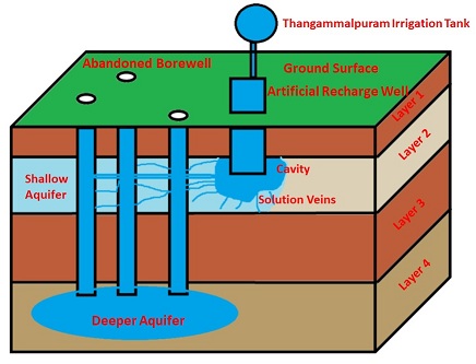 An open agricultural well in Ayyankulam was widely reported to recharge estimated 1,500-2,500 liters of water every second for several weeks without overflowing. The recharge water for this well was from the excess overflow of an adjacent minor irrigation tank due to the record monsoon rains in Nov-Dec 2021. The well became a local attraction and was called a "miracle well" since typical wells would fill and overflow in a matter of hours at such recharge rates [1]. Surface drainage and stream flow pattern were decided and controlled by the topography and the subsurface geology. Water generally takes the least resistive path while its selection of flow direction; deeper geological formations and its characteristics control the drainage thus provides the clue about the hydrogeology of the area. Erodable limestone, dolomite and marble formations provide a way for the subsurface flow of water with typical subsurface geological conditions. Many researches were conducted about the dissolution of calcareous rocks and karstification across the globe and because of its hydrological and constructional importance. Karst is considered as the effective source of water storage and supplies 40 to 50% of the World’s drinking water needs [2-5]. Typical geological signatures are visible associated with the complex structural features such as karst. Non-invasive geophysical methods such as electrical resistivity survey, electrical tomography, and seismic methods are preferable for mapping Karst topography [6-8]. The exceptional high velocity groundwater flow is observed in some wells at Aayankulam village and was focused with interest because that faster flow is only possible at Karst geology. Interestingly no previous records of karst topography are identified within the southern terrain. Electrical resistivity survey with a grid pattern of close intervals was conducted to get detailed picture of the geological features in small scale. Lineaments are the geological features control the flow of subsurface water within the particular region and can be effectively used as the potential indicator of flow direction [9]. It is necessary to examine the location and distribution of groundwater taking into account both its vertical and areal extents. It also requires identifying the geologic zones that are significant for groundwater as well as their structure in terms of their capacity to hold and yield water. Deep water-bearing zones can be directly recharged with water using recharge or injection wells, which are subsurface groundwater recharge techniques. Only in locations where there is a substantial impermeable layer between the soil surface and the aquifer that has to be recharged are recharge wells appropriate. They are also useful in areas where land is limited. The material encasing the aquifer can be used to cover recharge wells. If the material is not yet solidified, a screen can be inserted into the injection zone [10]. Due to its high degree of heterogeneity, which is frequently characterised by distinctive features such as cavities and sinkholes contained in a landscape with great spatial variability of weathering, karst is typically complex hydrogeologically. While it is difficult to characterise such heterogeneity using traditional hydrogeological techniques, geophysical technologies may provide insight into important elements that govern the hydrological behaviour of a karst aquifer [11]. Most of the research mainly used to identify the recharge well dynamics used the geochemistry (isotope) method. Groundwater recharge is characterised by the sources, circulation patterns, and geochemical evolution along flow pathways. The ability of the aquifer to store surface and subsurface flows has been evaluated hydrodynamically. [12-14]. Environmental tracers were utilized by to characterize the groundwater flow patterns [15]. [16-18] connected groundwater flow paths by combining groundwater and geochemical modelling with stable isotope analysis.