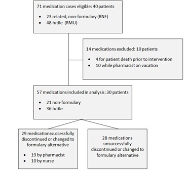 At the time of patient-admission, both RMU (futile) and RNF medications were identified by the hospice medical director. These cases were then assigned to either a hospice nurse or pharmacist to initiate discussions with patients or caregivers on discontinuation of RMU medications or the switch of RNF medications to formulary equivalents.