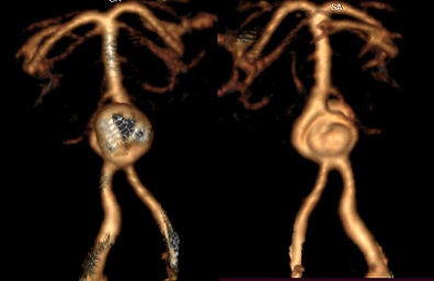 CT angiography is currently the best technique for the diagnosis and preoperative evaluation of these aneurysms. The 3D VRT reconstructions are valuable to understanding their often complex anatomy [9].