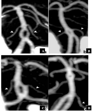 Figure 4 : Classification of basilarartery fenestrations. According to Gao, et al. [7] ; Type I (A): Fenestration before the emergence of the AICAs, Type II (B): Emergence of the two AICAs on fenestration, Type III (C): Emergence of a single AICA on fenestration, Type IV (D): Fenestration down stream from the origin of the AICAs.
