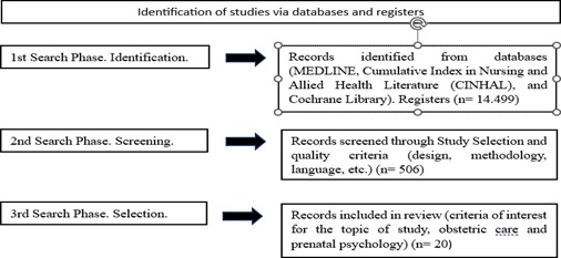 A literature review was conducted in the following databases: PubMed, Cumulative Index in Nursing and Allied Health Literature (CINAHL Cochrane Library. The search for scientific articles was carried out in English and Spanish. The keywords used were selected through the Medical Subject Headings (MeSH) and Health Sciences Descriptors (DeCS) terms. The terms were "pregnancy", "postpartum", "mental health", "prevention strategies". The search was carried out using the Boolean operator "AND". The Boolean combinations used were: "mental health AND prevention strategies AND pregnancy"; "mental health AND prevention strategies AND postpartum"; "pregnancy AND mental health"; "postpartum AND mental health". The initial search yielded a total of 14,499 articles. In order to refine and fulfil the research objective, several inclusion criteria were applied that helped to reduce the sample obtained: scientific articles published from 2018 to 2022; open access articles; qualitative, quantitative and mixed methodological designs; works whose central dimension was the prevention of mental health in pregnancy and postpartum. After applying the above criteria, a total of 506 articles were obtained. The third stage of the study involved the elimination of articles that were repeated in the 3 databases, studies that were opinion columns or recommendations, studies that were not published in the three databases. The third stage of the study involved the elimination of articles that were repeated in the 3 databases, studies that were opinion columns or general recommendations on gestational or postpartum care, articles that reflected studies on pathologies prior to gestation or in relation to pregnancies with assisted reproduction techniques. Finally, after the third stage of selection, a total of 20 scientific articles were obtained, which are presented in the bibliography, from which two analytical categories emerged and which are developed in the results section (Figure 1).