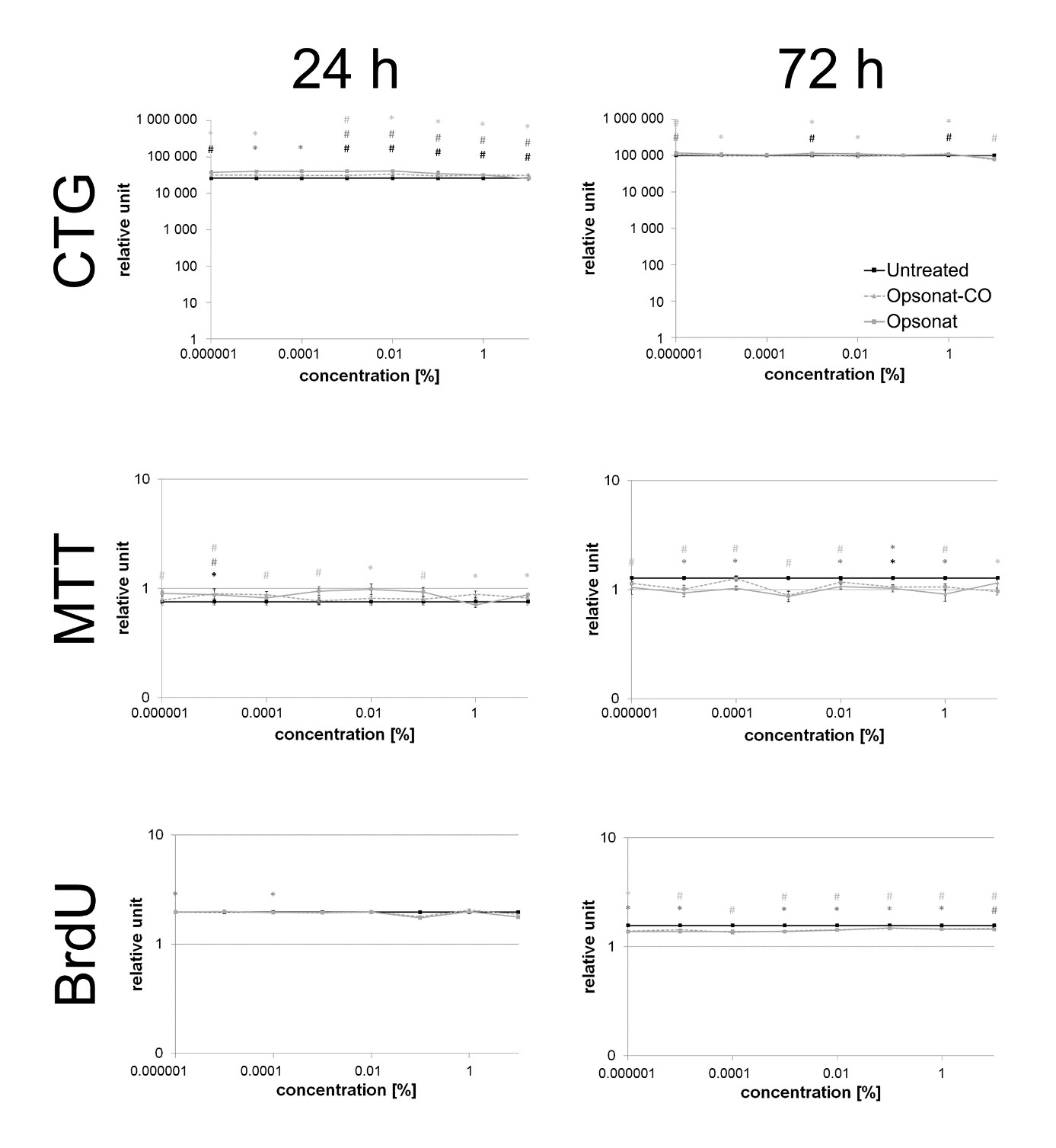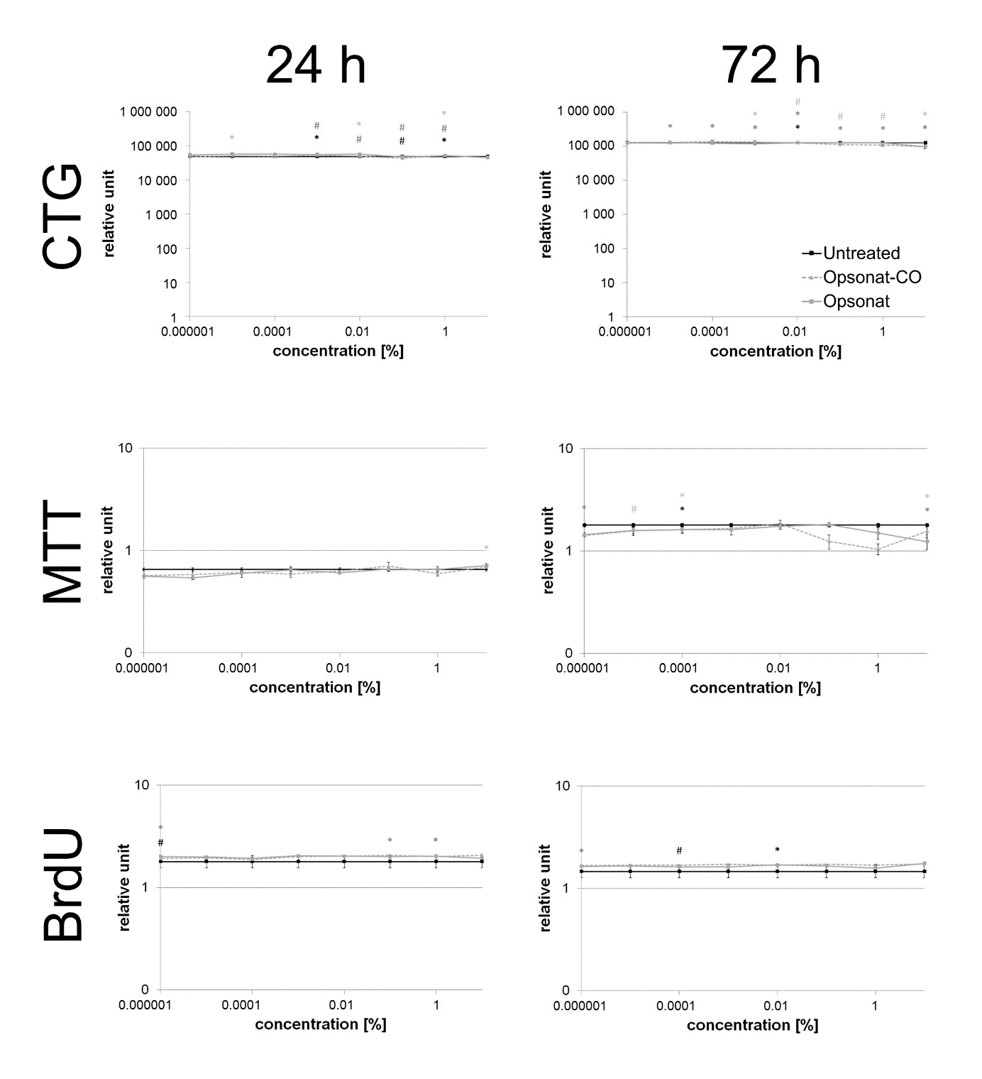 Cell viability and proliferation of BJ fibroblasts (CTG, MTT and BrdU) were measured after 24 hours and 72 hours. A p-value < 0.05 shown as * and a p-value < 0.005 shown as # are determined as statistically significant. Significance between test substance and carrier substance is shown as black, between test substance and untreated control shown as dark grey and carrier substance and untreated control shown as light grey.