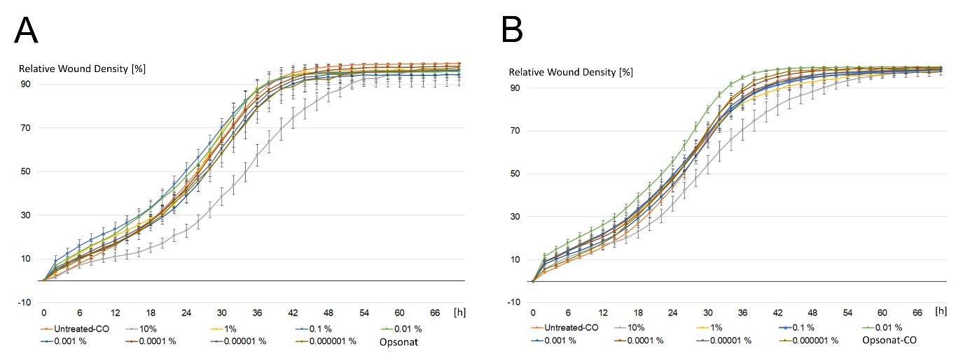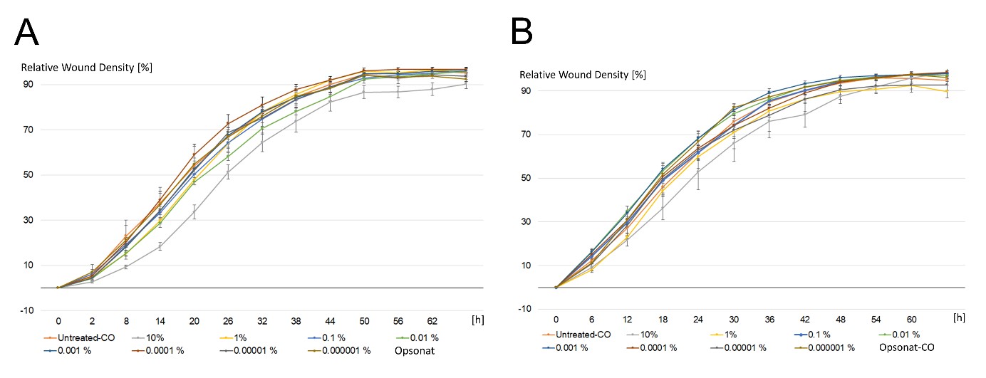 Relative wound density in percent of a scratch through keratinocytic celllayer incubated with serial dilutions of Opsonat® (A) and carrier substance (B) over time. Images were taken every six hours via Incucyte® S2.