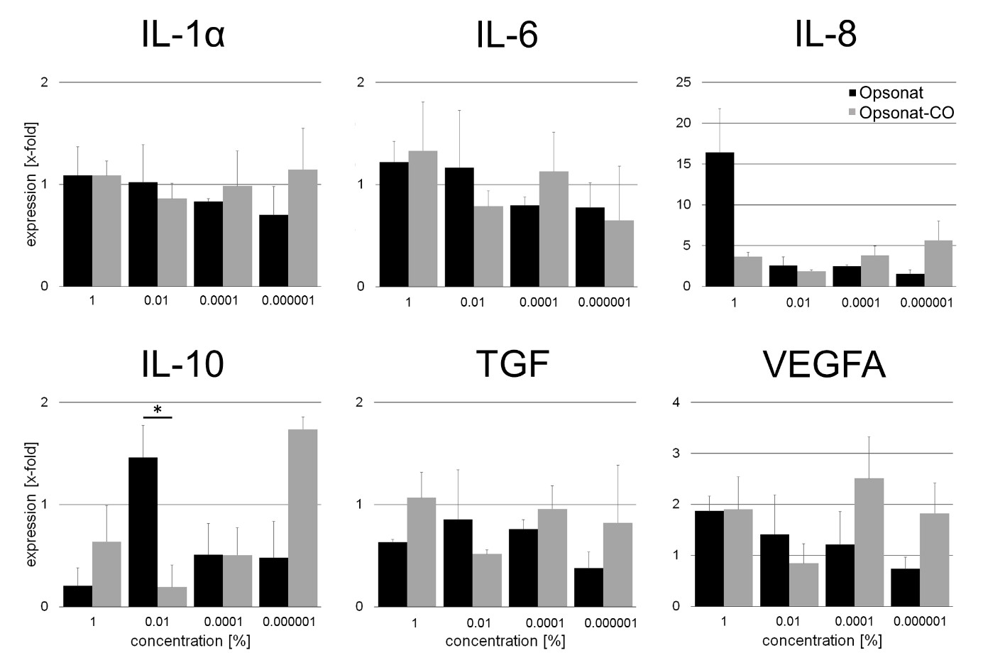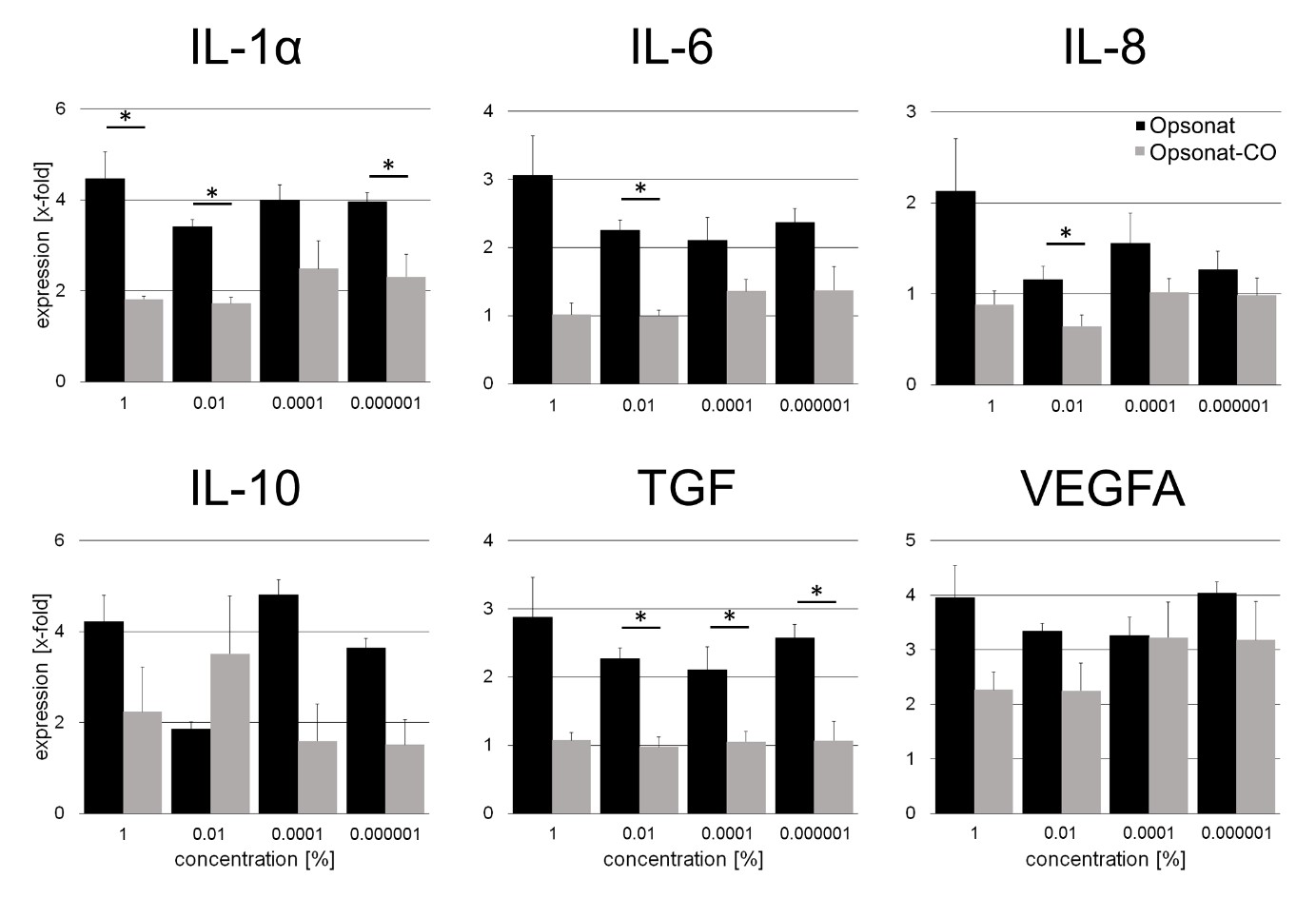 Gene expression data are presented as fold changes relative to untreated controls. In HaCaT keratinocytes, Opsonat® treatment resulted in a consistent upregulation of pro-inflammatory and anti-inflammatory cytokines as well as growth factors across all tested concentrations, compared to the carrier control, with fold changes ranging from 1.96 to 3.61. The only exception was IL-10 at 0.01%, which showed a 0.54-fold decrease. Notably, significant upregulation was observed for several genes, including: IL-1α: 1% (2.39-fold, p = 0.0196), 0.01% (1.92-fold, p = 0.0163), 0.000001% (1.69-fold, p = 0.0494). IL-6: 0.01% (2.15-fold, p = 0.0043). IL-8: 0.01% (1.69-fold, p = 0.0329). TGF: 0.01% (2.21-fold, p = 0.0029), 0.0001% (1.91-fold, p = 0.0486), 0.000001% (2.28-fold, p = 0.0302).