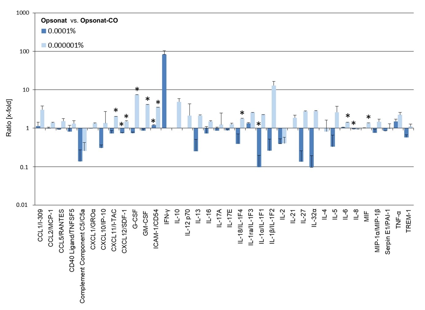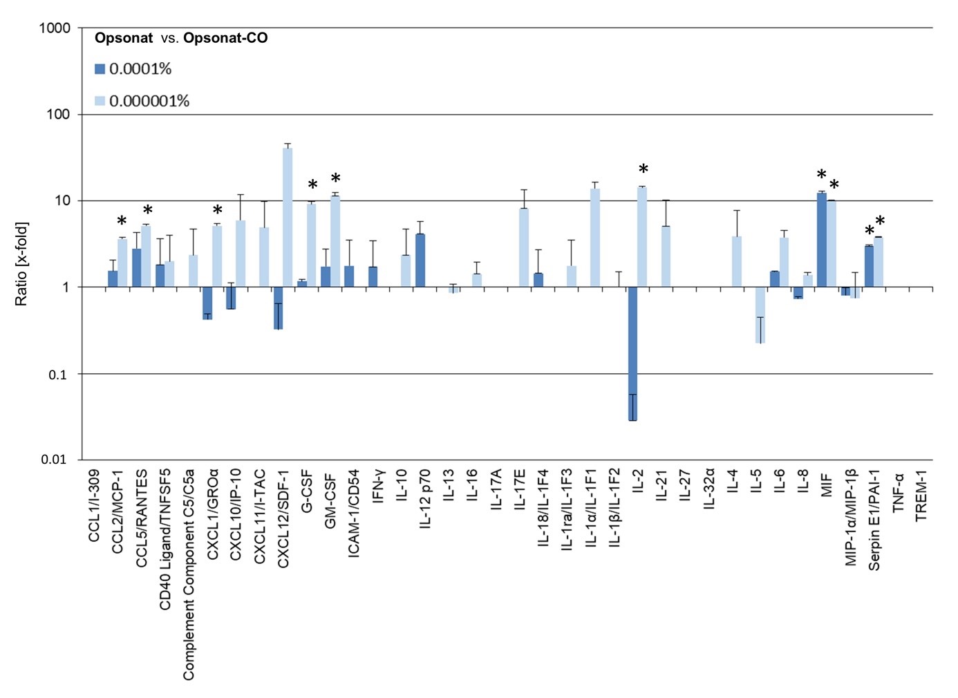 Protein expression with Opsonat® treated BJs as expression ratio (x-fold to carrier substance treated cells). A P-value Protein expression in HaCaT cells treated with Opsonat® at 0.0001% and 0.000001% showed significant upregulation compared to carrier controls. Notable increases were observed in: CCL2/MCP-1 (0.000001%: 3.61-fold, p = 0.0311), CCL5/RANTES (0.000001%: 5.14-fold, p = 0.0091), G-CSF (0.000001%: 9.21-fold, p = 0.0208), GM-CSF (0.000001%: 11.39-fold, p = 0.0174), MIF (0.0001%: 12.29-fold, p = 0.0188; 0.000001%: 9.95-fold, p = 0.0061), Serpin E1/PAI-1 (0.0001%: 2.98-fold, p = 0.0084; 0.000001%: 3.76-fold, p = 0.0204), IL-6, CD40 Ligand/TNFSF5, and others (non-significant trends). Only MIP-1α/MIP-1β showed a consistent reduction in expression.