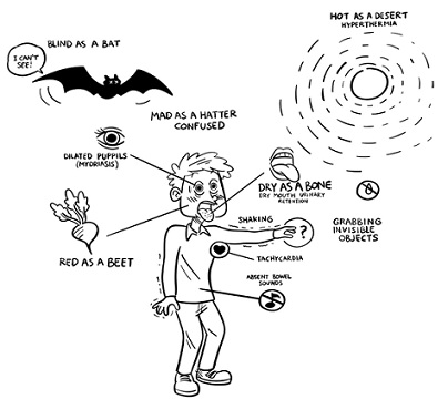 The cardinal signs of an anti-cholinergic delirium can be summarized as ‘red as a beet, blind as a bat, hot as a desert and mad as a hatter’.