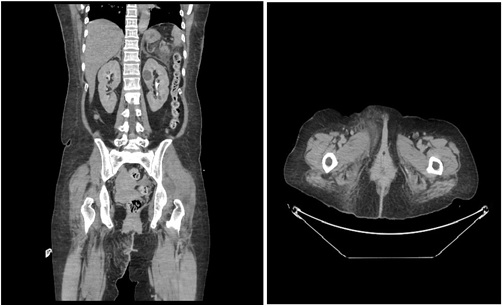A 41-year-old woman presented to the hospital with a two-day altered level of consciousness, Glascow Coma Scale (GCS) of 10/15, hypotension (77/64 mmHg), and tachycardia. This was also linked to septicemia and respiratory distress. Physical examination of the patient revealed that the lower abdomen was soft and non tender. During examination of the genitalia, erythema and induration were found in the perineal area, including the labia majora, as well as indurated necrotic spots on the right proximal medial thigh. Patient was resuscitated with fluids and vasopressors at the emergency room, and was electively intubated due to impaired consciousness.