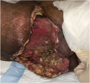 Based on the above-mentioned clinical, radiological and laboratory investigations, a diagnosis of Fournier’s gangrene was made. This diagnosis was further complicated by hyperosmolar hyperglycemic state and renal impairment with element of pancreatitis (multi organ dysfunction) with impaired GCS of 8. The patient was provided the medical care she needed to manage her diabetes and renal impairment. She was then given empirical antibiotics (meropenem) and an emergency wound debridement was planned, which included extensive debridement of the affected areas, including the labia majora, particularly on the right side (figure 2). The tissue sample from the debrided wound was sent for microbiological culture to identify the causative microorganism. The patient was then moved to Surgical Intensive Care Unit after surgery for additional round-the-clock care. The patient was also started on antifungals empirically and was overseen by the surgical team for wound care.