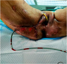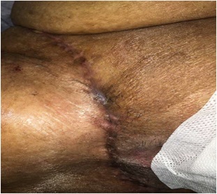 Patient’s condition gradually improved post diversion colostomy formation, and her GCS improved (15/15). During the follow-up, MRI pelvis with contrast was performed 4 weeks later that revealed no evidence of cortical erosion nor any destructive changes of the pubic bones and pubic rami on both sides. During post-operative follow-up period, the psychiatry team and medical team managed the patient’s gloominess and hyponatremia, respectively. The extensive wound closure was performed using 0/0 vicryl for subcutaneous layer and monocryl 2/0 for skin by the plastic surgery team. The closure was facilitated by performing a gluteal flap reconstruction making a small cut back incision along the lateral right gluteal area and drains were placed (figure 4).