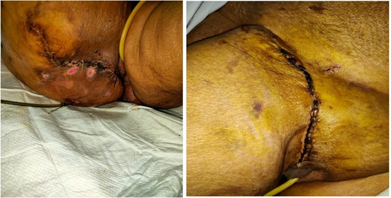 Patient was further followed by the team, and wounds were examined daily with regular dressings and she was maintained on a high protein diabetic diet to hasten the recovery. Further wound management also required Negative Pressure Wound Therapy (125-150 mmHg), which resulted in good wound healing (figure 5). Patient eventually underwent reversal of colostomy after complete wound healing 2 weeks later with complete wound healing (figure 6).