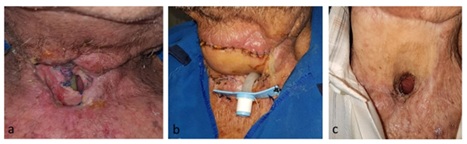 Figure 1: 1a: Picture shows wound breakdown in the midline with discontinuity at the neopharynx and even exposed nasogastric tube; 1b: Leakage recurred 2 days post reconstruction of pectoralis major flap; 1c: Full recovery of fistula 1 month after Botox A injection