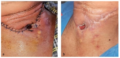 Figure 2: 2a: Pharyngocutaneous fistula at the left stoma edge, post total laryngectomy 7 days; 2b: Total closure of PCF at 1 week after Botox A injection