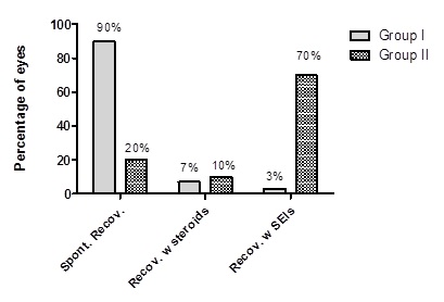 In comparing ocular symptoms one week to 10 days after treatment as shown in table 4, there was clinically significant differences between both groups in which all checked parameters were improved, with better results in group 1. Lid swelling was present in 20% of patients and 80% was normal in group 1, while it was present in 50% of patients and 50% was normal in group 2. Red eyes was present in 35% of patients and 65% was normal in group 1. While, it was present in 80% of patients and 20% was normal in group 2. Watery discharge was present in 15% of patients, and 85% was normal in group 1. While it was present in 40% of patients and 60% was normal in group 2. Photophobia was present in 30% of patients and 70% was normal in group 1. While it was present in 50% of patients and 50% was normal in group 2. Foreign body sensation was present in 25% of patients and 75% was normal in group 1. While it was present in 40% of patients and 60% was normal in group 2. Eye discomfort was present in 5% of patients and 95% was normal in group 1. While it was present in 20% of patients and 80% was normal in group 2. Table 5 shows ocular signs one week to 10 days after treatment with also, clinically significant difference between the groups with better results in group 1. Lid edema was present in 25% of patients and 75% was normal in group 1, while it was present in 40% of patients and 60% was normal in group 2. Follicular conjunctivitis was present in 30% of patients and 70% was normal, while it was present in 36.6% and 63.4% was normal in group 2. Sub-Conjunctival hemorrhage was present in 75% of patients and 25% was normal in group 1, while it was present in 76.7% and 23.3% was normal in group 2. Pseudo membrane was present in 40% of patients and 60% was normal in group 1, while it was present in 60% of patients and 40% was normal in group 2. Preauricular lymphadenopathy was present in 90% of patients and 10% was normal in group 1 and 2 respectively. Punctate epithelial keratitis was present with moderate degree in 60%, mild degree in 35% and with severe degree in 5% of patients in group 1, while it was present with moderate degree in 73.3%, mild degree in 14.7% degree and with severe degree in 12% of patients in group 2. Table 6 shows ocular signs 3 months after treatment, in which White subepithelial infiltrates was present in 3% of patients and 97% was normal in group 1, while it was present in 30% of patients and 70% was normal in group 2 with clinically significant difference. Anterior stromal infiltrate was present in 3.3% of patients and 96.7% was normal in group 2, while it was not present in group 1. Table 7 and figure 1 shows the final recovery outcomes in which spontaneous recovery without corneal opacities was achieved in 90% of patients in group 1, while it was achieved in 60% of patients in group 2 with clinically significant difference (p≤0.001). Recovery with corticosteroid was achieved in 7% of patients in group 1, while it was achieved in 10% of patients in group 2 with no clinical significant difference (p=0.9). Recovery with subepithelial corneal infiltrates was achieved in 3% of patients in group 1, while it was achieved in 30% of patients in group 2 with high clinical significant difference (p≤0.0001).