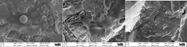 Figure 1: Microscopic implant surface with a double acification, numerous cells and collagen bridge can be seen on the implant surface