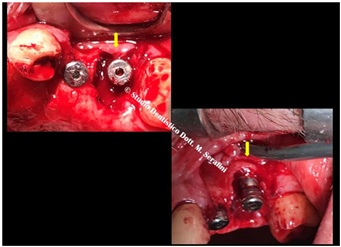 After the avulsion and careful dressing (toilette) of the surgical site, 2 implants were inserted, a standard 3.75 di 13mm and a 2s implant for the crestal Sinus Lift (Yellow arrow in figure 15).
