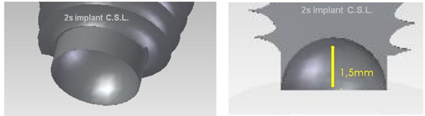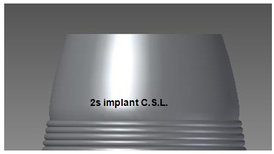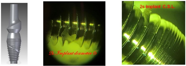 It also minimizes Bone Crestal Remodeling and guarantees long-term maintenance of the crestal bone. It has a sharp apical thread and the subsequent increase in thickness, with a concave profile; gives a 2s implant a remarkable self-tapping capacity, self-bradding and atraumatic bone compaction, both vertical and horizontal (Figures 2-4).