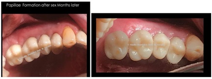 Final result with one-to-one fixed prosthesis in lithium disilicate with formation of papillae and orange peel mucosa (Figure 32).