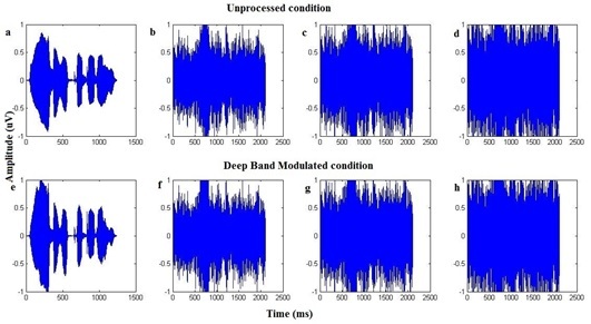 The observed benefit in the phrase recognition performance induced by the proposed deep band modulation was found in good performers. Further research is needed to establish the benefit of DBM in multi-talker noise, where the modulation depth may vary in relation to speech. Modulation of the background sounds may become difficult to detect with an increase in the modulation depth in the phrase, especially when loudness recruitment in them close to its asymptotic value of the internal modulation depth and near-saturation of fluctuation strength [29]. Thus, it may be imperative to perform the psychoacoustic measures (such as temporal envelope detection and discrimination) and substitute the same threshold to enhance the depth of the target phrase, which may help understand the speech in the presence of noise especially for poor performers.