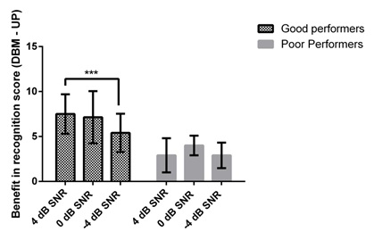 Figure 2: Benefit in the recognition score at each of the SNRs from the good and poor performers.