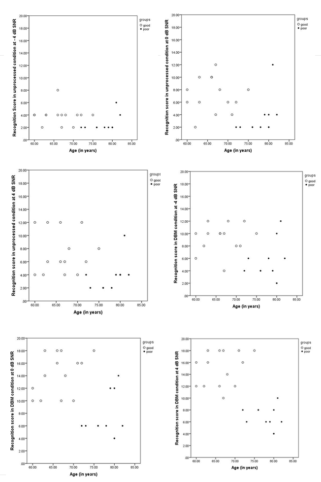 When the aggregate data was analyzed, a few individuals in whom the score at 4 dB SNR in unprocessed condition was already poor, the magnitude of deterioration in performance was even poorer because of the lesser SNRs yields floor effect. Besides, the recognition of unprocessed speech has no relation with the age of the participants, irrespective of SNRs. However, the speech recognition score worsened due to an increased threshold in temporal resolution ability and it is valid for SNR. To deduce the floor effect by noise, recognition of phrase has no relation with age but found a relation with temporal resolution ability made to rethink sub grouping the cohort. Thus, we have sub-grouped the data into good and poor performers based on the gap detection threshold to confirm the effect of the DBM condition on the recognition score in the presence of noise.