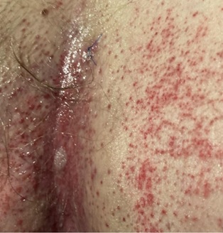 Figure 1: Non-blanching erythema of the inguinal crease with surrounding scattered erythematous papules and superficial well-demarcated erosions.