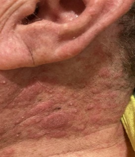 Figure 2: Left Lateral neck with erythematous papules and plaques intermixed with scattered non-follicular studded pustules.
