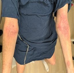 A man in his 60s with HER2-amplified, RAS/RAF wild-type and MMR-proficient metastatic sigmoid colon cancer presented to the emergency department with severe dermatitis six days after receiving his first infusion of atezolizumab and pertuzumab/trastuzumab/hyaluronidase subcutaneous injection as part of a clinical trial. The patient was treated with prednisone 100 mg by mouth daily, which is the equivalent of 1 milligram per kilogram, with instructions to taper by 10 mg weekly. Soon after discharge, he was evaluated by dermatology and noted to have erythematous papules coalescing into plaques on the trunk and extremities most prominent in a flexural distribution (Figures 1-3). Punch biopsies were performed to further characterize the rash, which demonstrated sub corneal pustules consistent with acute generalized exanthematous pustulosis (AGEP) (Figure 4). Despite discontinuing anti-cancer therapy and the use of concurrent oral and topical steroids, his rash progressed and he reported decreased functional status, prompting hospital admission (Figure 5). While admitted he was noted to have leukocytosis with neutrophilia, acute kidney injury, elevated liver function tests, and hypocalcemia. Blood cultures were drawn and demonstrated Corynebacterium species. The patient was treated with methylprednisolone 125 mg intravenously once daily, and vancomycin intravenously with a trough level goal of 15-20 mcg/ml. On day three, the patient had significant clinical improvement with restored renal and hepatic function testing. The patient was discharged from the hospital on a steroid taper and a short course of oral doxycycline.