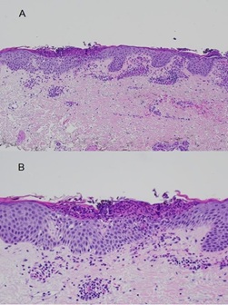 Figure 4: Histopathology sections stained by (H&E) at x 10 magnification (panel A) and x 40 magnification (panel B) illustrating a prominent sub corneal neutrophilic pustule with a dermal lymphohistiocytic infiltrate consistent with acute generalized exanthematous pustulosis.