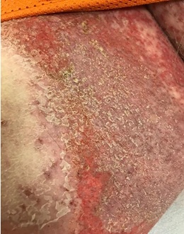 Figure 5: Inguinal crease, day 27 after atezolizumab infusion and pertuzumab/trastuzumab/hyaluronidase subcutaneous injection, beefy red edematous plaques with overlying desquamative asteatotic scale.