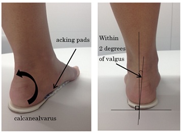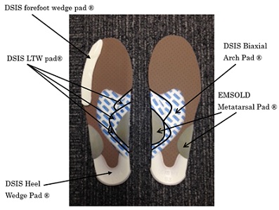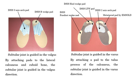 DSIS Biaxial Arch Pad®, DSIS LTW Pad®, and DSIS Heel Wedge Pad® were attached so as to cover the talus on the posterior calcaneus of the medial arch, and were manufactured to guide the subtalar joint to varus.