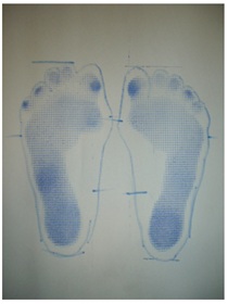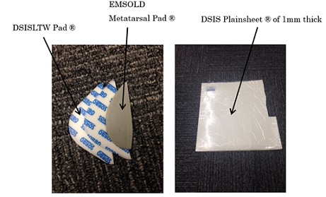 Using DSISLTW Pad®, DSIS Plainsheet®, and EMSOLD Metatarsal Pad®, while stacking the pads so that the calcaneus is within 2 degrees of 8 degrees of right pronation and 2 degrees of 10 degrees of left pronation. Fine adjustments were made (Figures 6 & 7).