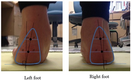In a previous study by Okubo et al., a normal hindfoot was defined as within ±2 degrees from 0 degrees perpendicular to the floor surface, and subtalar joint valgus was defined as a hindfoot inclination of 3 degrees or more inward [7] (Figure 2).
