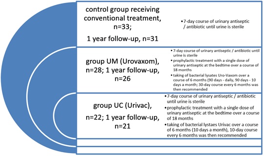A prospective, open, multicenter, parallel-group randomized CRUTIL study was conducted in 83 children aged 3 to 15 with recurrent Urinary Tract Infections (UTI). Children were randomized into 3 groups: First-UC-consisted of 22 children receiving lysate Urivac therapy, second-UM-consisted of 28 children receiving additional lysate Uro-Vaxom therapy and third-control group-consisted of 33 children receiving standard therapy. The observation period lasted for 24 months. 78 children were available to analyze in 1 year follow-up.