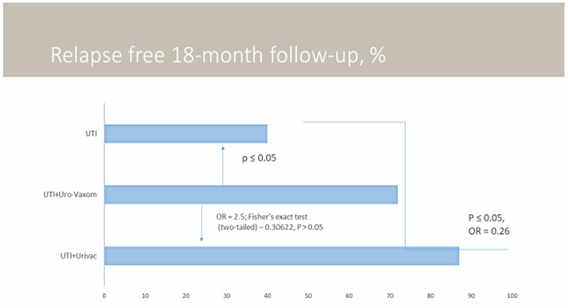 CRUTIL trial has shown high efficacy of the two lysates used. However, Urivac has proved to have a more lasting effect. Its mode of action aimed at a fast adaptive (acquired) immune response in local inflammation through MALT system activation: Increase of macrophage and T-cell activity, increase in secretory IgG on the surface of urinary tract mucosa and activation of protective adhesion molecules [19]. Clearly, Urivac is more effective because it affects more causative organisms and due to principle of strengthening the response when causative organisms are increased, where the immune protection is directed against a vast list of microorganisms [20].